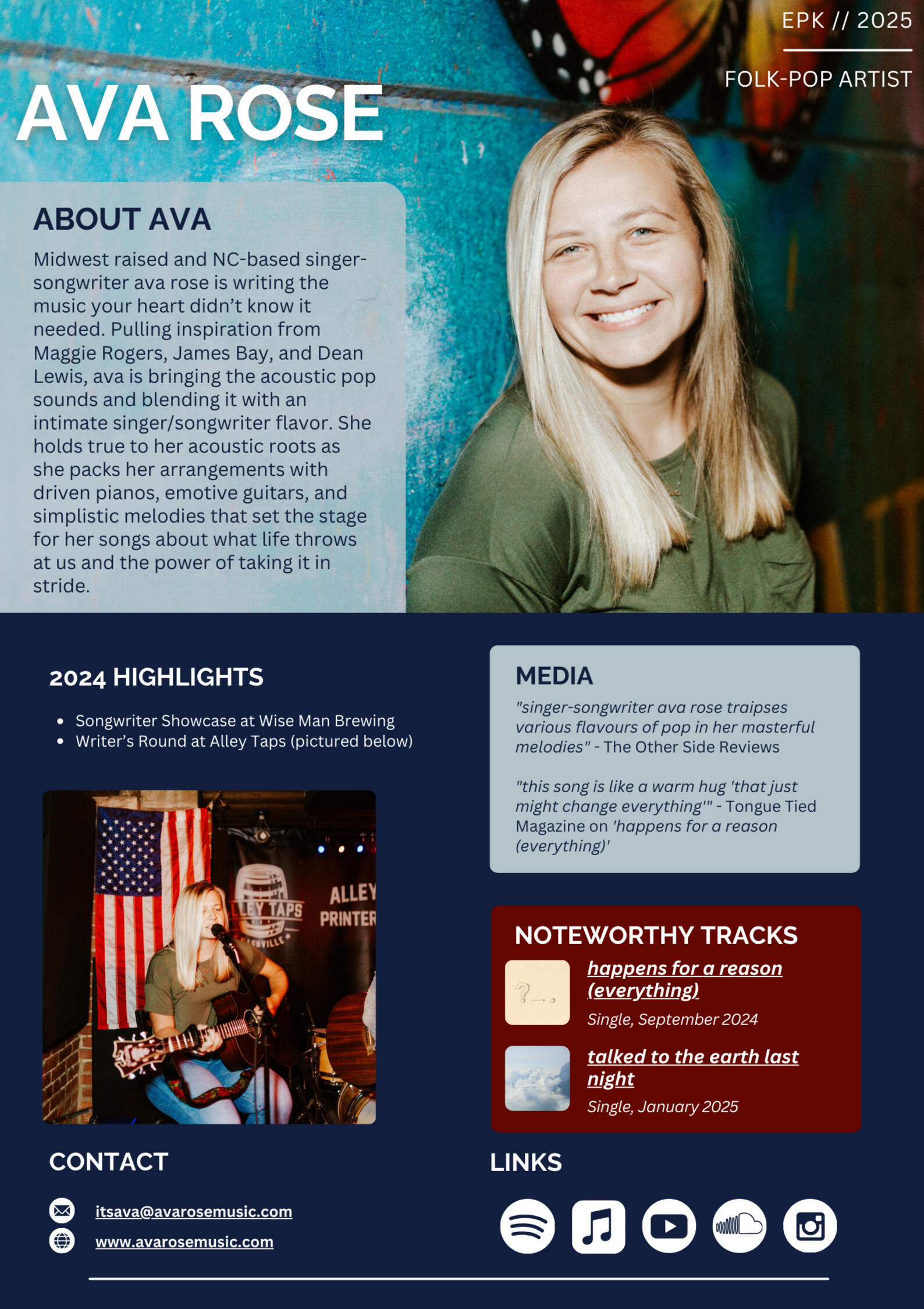 Midwest raised and NC-based singer-songwriter ava rose is writing the music your heart didn’t know it needed. Pulling inspiration from Maggie Rogers, James Bay, and Dean Lewis, ava is bringing the acoustic pop sounds and blending it with an intimate singer/songwriter flavor. She holds true to her acoustic roots as she packs her arrangements with driven pianos, emotive guitars, and simplistic melodies that set the stage for her songs about what life throws at us and the power of taking it in stride.ava began making songs she learned in piano lessons all her own, and the songwriting seed has been watered ever since. Building arrangements and navigating her way around a guitar, she's been building her artistry one instrument and song at a time. Breaking into the current artist project, she stepped out in 2022 with two 4-track EPs, february EP and from one heart to another. This became her debut as a singer and set the tone for what should be expected of the ava rose project.Diving deeper into her own experiences and exploring outside her comfort zone, ava went into 2023 writing and refining her project's first full-length album, growing pains. This further defined what she represents as an artist: taking on whatever is thrown your way, learning from it, and trying to come out stronger on the other side.2024 carried this same energy of exploration and refinement as ava released songs like puppet show, where we go, and the current. She even paid homage to the project that is truly her artistic foundation and released a live version of four tracks off of her album. And to cap off the year, she latched onto her folk-pop sound and hit hard with happens for a reason (everything), a track that most clearly defines what ava hopes to leave every listener with.More than anything, the mark of the ava rose project is aimed to help listeners "embrace the rain". In a world where things are thrown at you and are out of your control, all you have to do is focus on making the most of it, taking the obstacles you've had to overcome, and recognizing the person you've become at the end of it all.We're all human, we all have had our share of stuff to handle, but it's what we make of it that holds the most value. Don't wait for the storm to settle, embrace the rain.